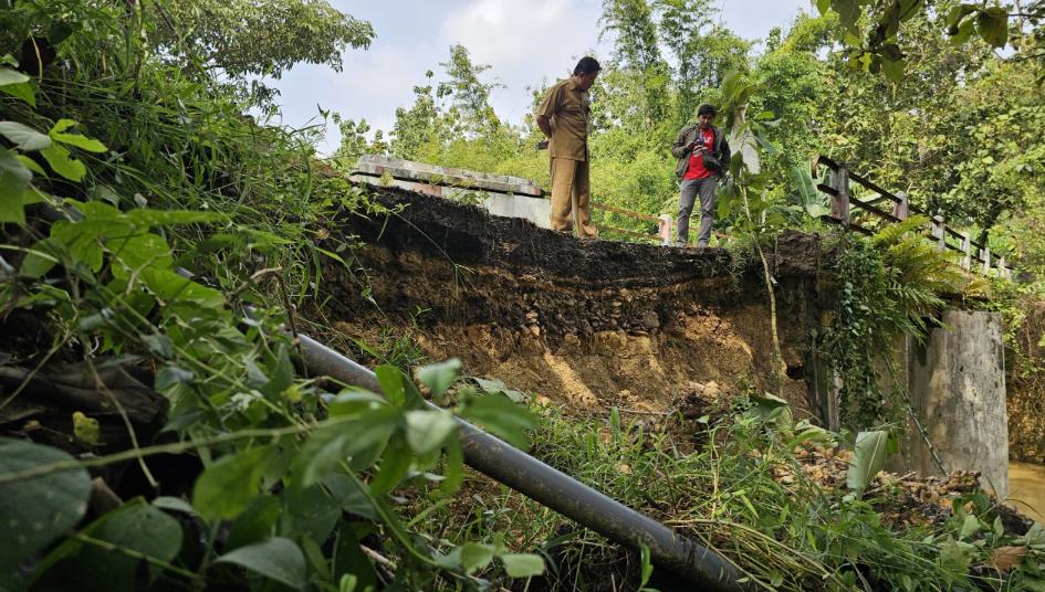 Pasalnya, longsoran pada bahu jalan tepat sebelum memasuki jembatan longsor cukup lebar dan berpotensi merobohkan kontruksi jembatan.